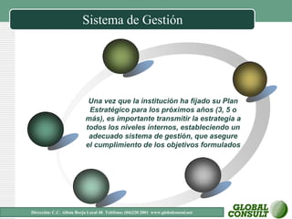 El documento describe un sistema de gestión para ejecutar la estrategia de una organización. El sistema integra todos los objetivos, políticas y estrategias en matrices de gestión con relaciones causa-efecto. El sistema se implementa en 6 fases a lo largo de 6 semanas para definir planes de acción, asignar recursos, revisar la información y entregar el trabajo final.