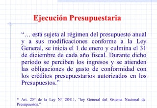 El documento describe los procedimientos y responsabilidades relacionados con la ejecución presupuestaria en el Perú. Explica que la ejecución presupuestaria se realiza anualmente del 1 de enero al 31 de diciembre, y que involucra la estimación, determinación y percepción de ingresos, así como el compromiso, devengado, giro y pago de gastos. También describe los procesos de aprobación del presupuesto institucional anual, programación mensual de ingresos y gastos, y la Previsión Presupuestaria