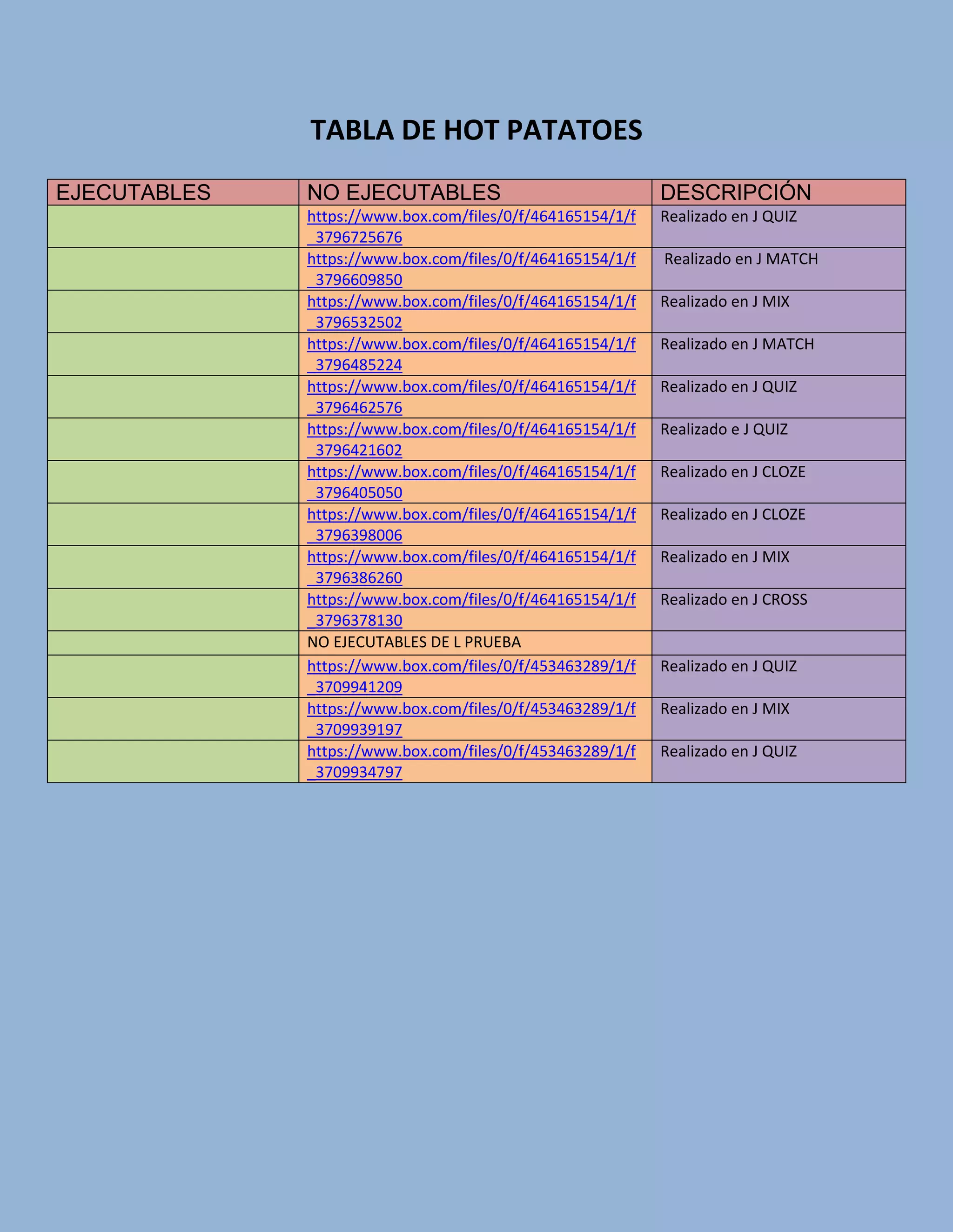 Este documento presenta una tabla con enlaces a archivos ejecutables y no ejecutables de pruebas realizadas en diferentes tipos de actividades como J Quiz, J Match, J Mix, J Cloze y J Cross. La tabla incluye enlaces, descripciones de cada actividad y si son ejecutables o no.