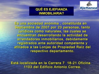 EjeFiianza Inmobiliaria es una compañía de fianzas para propietarios inmobiliarios que garantiza el pago de cánones de arrendamiento y servicios públicos por parte de los arrendatarios. La compañía ofrece estudios de crédito, seguros de arrendamiento, y fianzas para proteger a los propietarios de incumplimientos de pago. EjeFiianza busca facilitar las transacciones inmobiliarias y promover el desarrollo económico del sector.