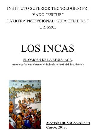 Este documento resume el origen de la etnia inca en el Cusco según dos mitos principales. Explica que antes de los incas, el valle del Cusco estaba habitado por pequeñas etnias como los Huallas y Sahuaseras. Los incas llegaron luego y se aliaron con estas etnias. El primer mito cuenta que Manco Cápac y Mama Ocllo fundaron el Cusco después de que una vara de oro que llevaban se hundiera allí. El segundo mito habla de los hermanos Ayar que llegaron de Pacaritam