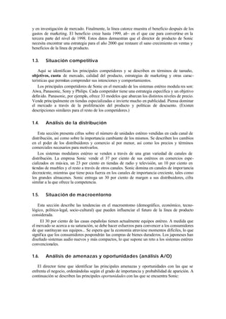 El documento presenta un plan de marketing propuesto para mejorar los resultados de la línea de productos Allegro de sistemas de audio modulares de la compañía Sonic. El plan incluye un análisis de la situación del mercado, los productos, la competencia y la distribución, así como objetivos financieros y de marketing. La estrategia propuesta se centra en mejorar el posicionamiento de la marca, ampliar la cartera de productos, aumentar los esfuerzos de distribución y publicidad, e invertir más en I+D para desarrollar nue