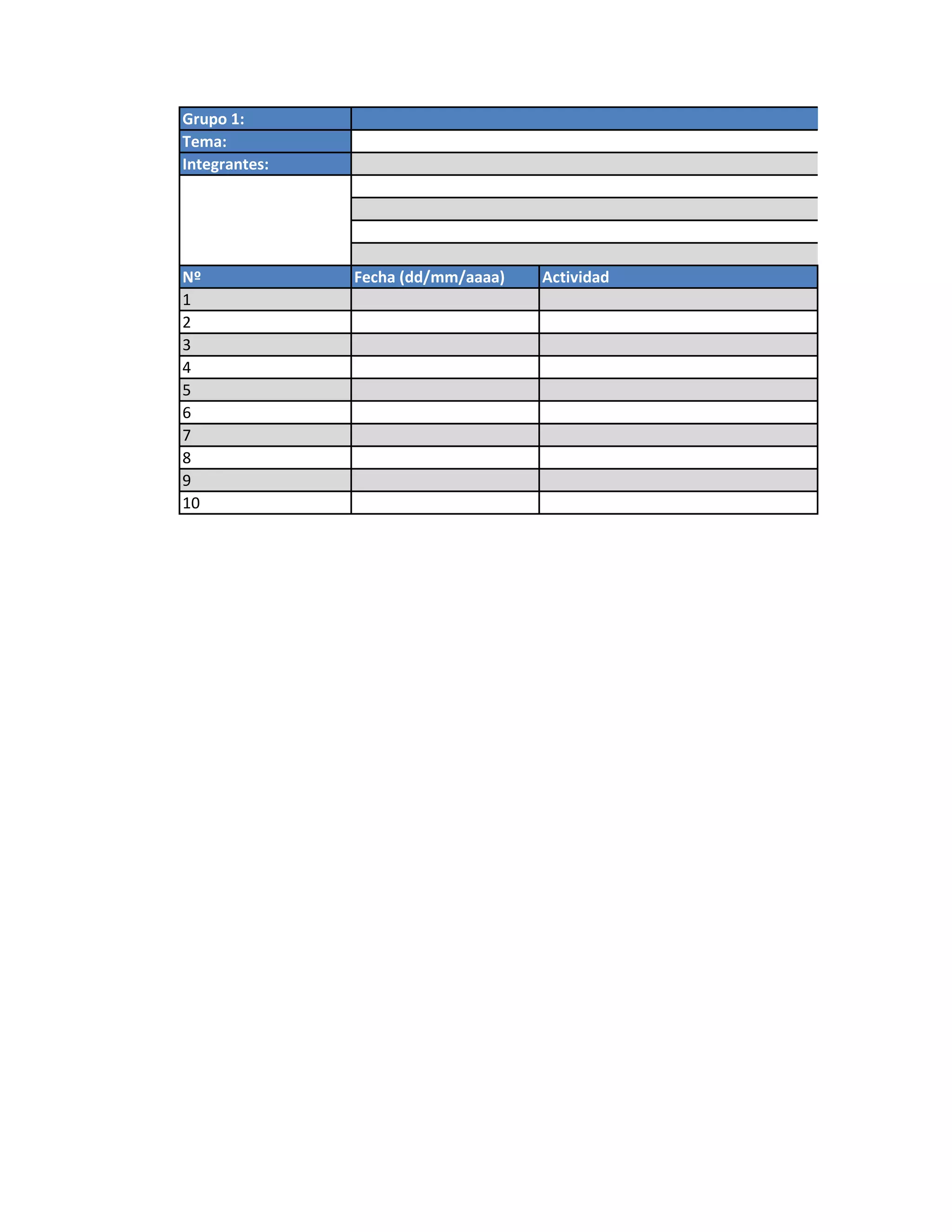 Este documento presenta un formato para registrar las actividades de un grupo de trabajo. Incluye columnas para el número de actividad, fecha, descripción de la actividad, responsable, participantes y recursos asociados. No contiene información sobre el tema del grupo o sus integrantes.