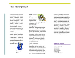 Este documento presenta una organización y sus productos y servicios. Describe brevemente los servicios principales en los paneles interiores, con títulos secundarios para organizar la información. Incluye la información de contacto de la organización en la parte inferior.