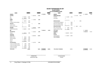 Este documento presenta los balances generales de la empresa distribuidora Balmar al 31 de diciembre de 2001 y 2002. En 2001, los activos totales fueron de $235,448, de los cuales $131,993 eran activos corrientes y $103,455 eran activos fijos. En el balance de 2002, los activos totales aumentaron a $275,001, con $239,649 en activos corrientes y $35,352 en activos fijos. Ambos años mostraron más del 80% de los pasivos en pasivos corrientes, mientras que el patrimonio