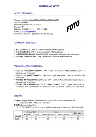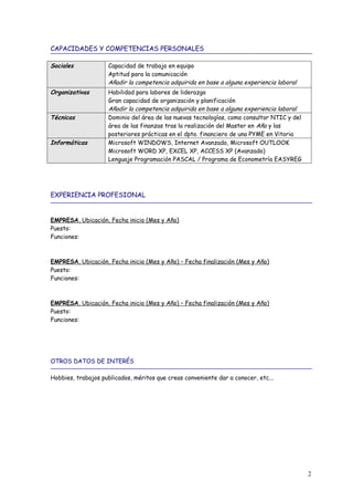 Este currículum vitae resume la formación y experiencia profesional de una persona. Detalla su educación formal que incluye varios títulos universitarios, cursos complementarios y capacitación en idiomas. También presenta habilidades técnicas adquiridas, experiencia laboral previa en varios puestos y datos personales de contacto.