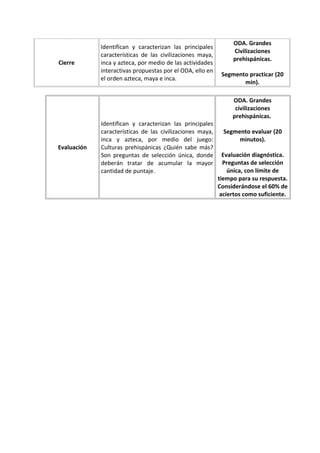 El documento presenta un plan de lección para 7° básico que utiliza un objeto digital de aprendizaje (ODA) para enseñar sobre las civilizaciones maya y azteca. El ODA guía a los estudiantes a través de actividades interactivas para identificar las características clave de estas civilizaciones, como su urbanización, sistemas de riego y comercio. La lección termina con una evaluación en forma de juego para medir la comprensión de los estudiantes.