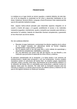 Este documento describe un proyecto lúdico-recreativo y cultural llamado "Aprende Jugando" dirigido a niños de 2 a 12 años en el municipio de San Roque, Antioquia. El proyecto busca crear un espacio llamado ludoteca donde los niños puedan desarrollarse a través del juego de manera integral. La ludoteca ofrecerá varias actividades como juegos, celebraciones especiales, tardes recreativas y proyecciones con el objetivo de fomentar el aprendizaje, la creatividad y