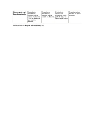 Este documento presenta una rúbrica para evaluar las habilidades de lectura independiente de estudiantes de primaria. La rúbrica evalúa la capacidad de los estudiantes para escoger libros apropiados, concentrarse en la historia, comprender los elementos clave de la historia como personajes y escenario, interpretar a los personajes, mantenerse enfocado durante la lectura, y resumir y predecir la historia. La rúbrica clasifica estas habilidades en cuatro niveles de 1 a 4.
