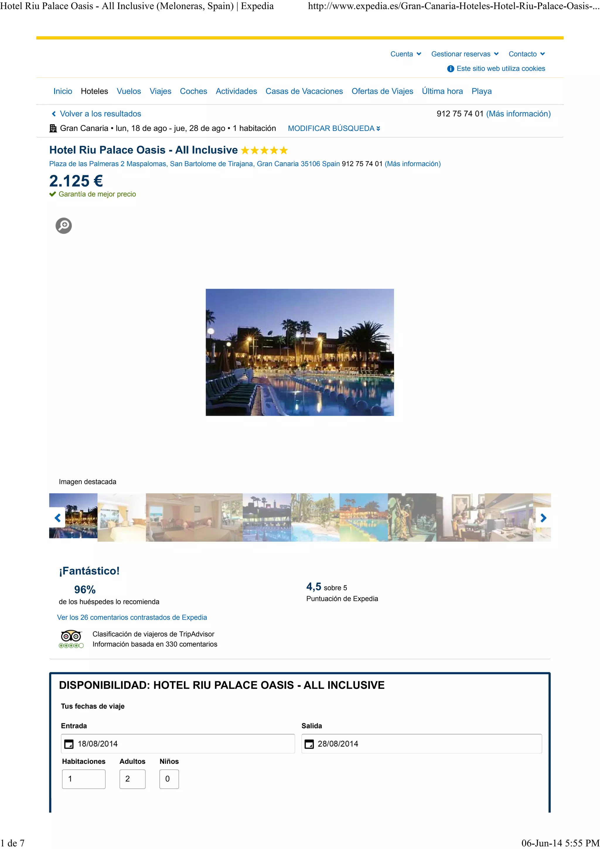 Este documento proporciona información sobre el Hotel Riu Palace Oasis en Gran Canaria, España. Se trata de un hotel de lujo ubicado frente a la playa con 332 habitaciones y servicios como spa, piscinas, canchas de tenis y restaurante todo incluido. El hotel ofrece habitaciones con vistas al jardín, al mar o laterales, con televisión por satélite, aire acondicionado y minibar.