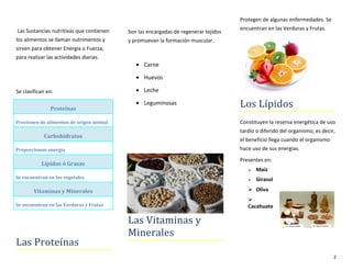 El documento habla sobre los principales carbohidratos como el maíz, el arroz, la avena y el trigo, que se encuentran en cereales, y la papa, el camote y la yuca, que se encuentran en tubérculos. También describe las proteínas, lípidos, vitaminas y minerales como sustancias nutritivas importantes que se obtienen de alimentos y cumplen funciones vitales para el cuerpo. Resalta que una buena nutrición ayuda al crecimiento, la salud y la recuperación.