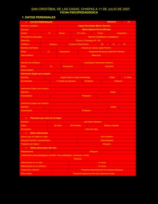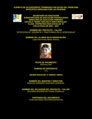 El documento presenta el expediente de Martín Antonio López Hernández, un alumno de 4° grado que muestra problemas de disgrafía y rendimiento académico bajo. Se realizó una evaluación psicopedagógica que encontró deficiencias motrices y de escritura, posiblemente causadas por una familia disfuncional y falta de apoyo. Se recomienda terapia y apoyo adicional para mejorar las habilidades motrices y de aprendizaje de Martín.