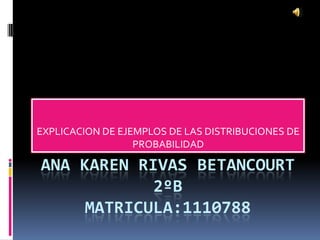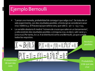 Este documento proporciona ejemplos de diferentes distribuciones de probabilidad, incluyendo: Bernoulli, binomial, Poisson, normal, gamma y t de Student. Explica cada distribución a través de un ejemplo numérico, detallando los parámetros involucrados y cómo calcular la probabilidad de diferentes resultados.