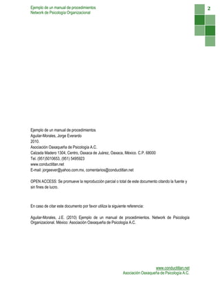 Este documento presenta un ejemplo de manual de procedimientos para la empresa A515TE: Educación asistida por computadora. Incluye información sobre antecedentes, marco normativo, objetivos, diagramas de flujo del proceso de selección de personal, formatos, términos clave y responsables de cada actividad. El manual busca documentar de manera ordenada y estandarizada los pasos a seguir en los procesos de la empresa para garantizar su correcta operación.