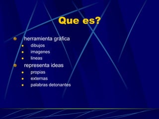Los mapas mentales son herramientas gráficas que representan ideas propias y externas mediante palabras claves, imágenes, líneas y conectores. Son útiles para docentes, estudiantes y profesionistas ya que permiten clasificar y generar información de manera visual para presentaciones y exposiciones. Los mapas mentales captan información en tiempo real de conferencias y exposiciones, y también son útiles para organizar cursos y lecturas siguiendo algunas reglas como disponer los elementos de forma horizontal en una hoja o pantalla en blanco con la idea principal