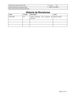 Este documento presenta el Plan de Desarrollo de Software para el proyecto de desarrollo de un nuevo Sistema para la Gestión del Registro de Nombres de Dominio de Internet bajo ".es". Se describe el alcance, objetivos y entregables del proyecto. Se detallan las fases e iteraciones propuestas siguiendo la metodología RUP. Finalmente, se incluyen secciones sobre la organización del proyecto y la gestión del proceso de desarrollo.