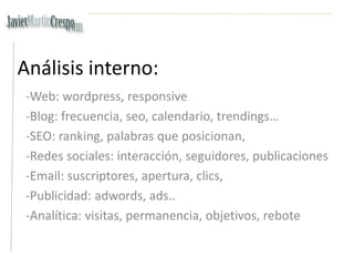 El documento detalla un plan digital que abarca objetivos clave como la integración de canales digitales, la gestión de recursos y la optimización de marca y audiencia. Incluye un análisis interno y externo, identificando fortalezas, debilidades, oportunidades y amenazas, así como estrategias enfocadas en branding, SEO, generación de leads y fidelización. Además, se establecen métricas para evaluar el retorno de inversión (ROI) y el rendimiento de las acciones digitales.