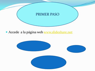 El documento proporciona instrucciones en 4 pasos para compartir presentaciones en SlideShare: 1) Acceder a www.slideshare.net, 2) Registrarse con un nombre de usuario y contraseña, 3) Subir presentaciones en PowerPoint u OpenOffice una vez registrado, 4) La presentación se convierte a formato flash para compartir por correo electrónico u otros medios una vez publicada.