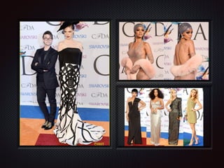 El documento describe el Council of Fashion Designers of America (CFDA), un evento de moda considerado como los "Oscars de la moda" en Estados Unidos. La organización busca reforzar la influencia de diseñadores estadounidenses en la economía mundial. Los ganadores de los premios CFDA son votados por un grupo de más de 1,500 miembros del CFDA y editores de moda, y son anunciados en un evento anual en el Lincoln Center en Nueva York. El documento concluye que el evento CFDA es un "espectáculo"