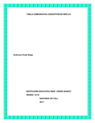 El documento presenta una tabla comparativa de diferentes conceptos relacionados con la Web 2.0 como páginas web, blogs, plataformas de redes sociales, nube electrónica y paquetes de Office. Explica las diferencias y semejanzas entre estos conceptos a través de definiciones y ejemplos. Además, analiza la evolución de la Web 2.0 a la Web 3.0, describiendo características como contenidos semánticos y búsquedas de lenguaje natural.