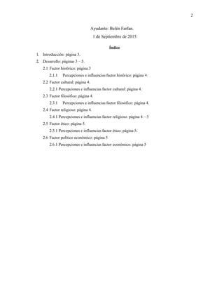 Este documento presenta el campo de historicidad de una estudiante chilena de 19 años llamada María González. Describe los diferentes factores que han influenciado su desarrollo como persona de acuerdo a la teoría de Castillejo, incluyendo factores históricos, culturales, religiosos y éticos. Resalta que su formación estuvo influenciada por sus padres católicos y su educación en un colegio católico, lo que moldeó sus valores de servicio a los demás.
