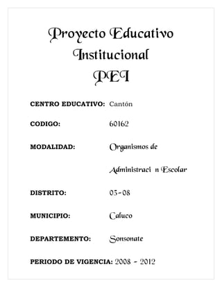Este documento presenta el Proyecto Educativo Institucional del Centro Escolar Cantón para el período 2008-2012. Resume los principales objetivos como mejorar el rendimiento académico, mantener que los estudiantes no repitan grados, disminuir la sobreedad y mantener la asistencia diaria de los estudiantes. También incluye el proyecto curricular con acuerdos para fortalecer las prácticas pedagógicas, mantener el refuerzo académico, disminuir la sobreedad y mejorar la infraestruct
