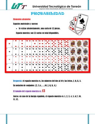 Este documento presenta varios ejemplos y ejercicios sobre probabilidad y espacios muestrales. Explica conceptos como espacio muestra, sucesos favorables y casos posibles para calcular probabilidades de eventos al extraer cartas de una baraja o bolas de una caja. Luego resuelve ejercicios calculando probabilidades de obtener ciertas cartas o figuras al extraer de una baraja, o números al lanzar un dado varias veces.