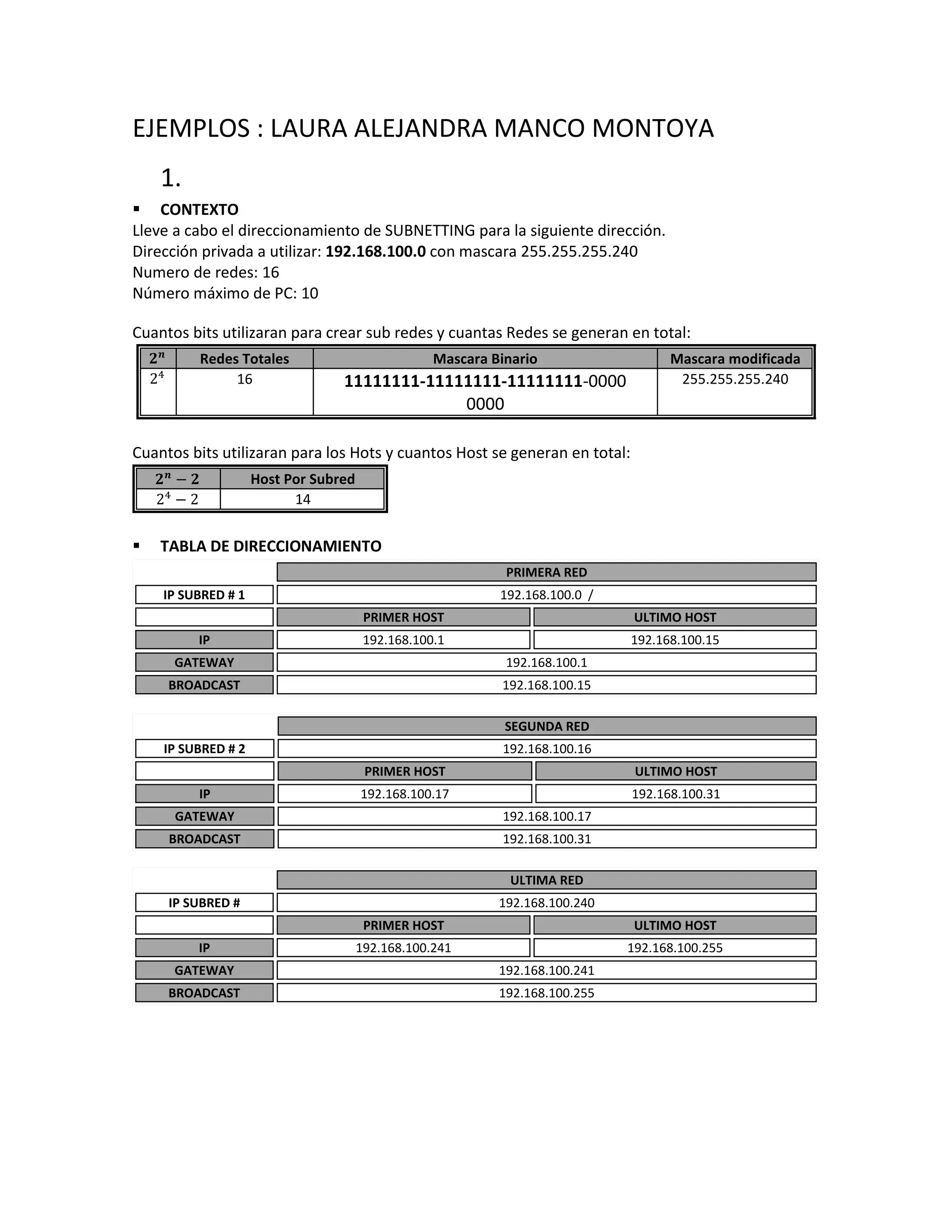 El documento describe dos ejemplos de direccionamiento de subredes. El primer ejemplo utiliza la dirección 192.168.100.0/28 para crear 16 subredes con hasta 10 hosts cada una. El segundo ejemplo utiliza la dirección 172.16.0.0/12 para crear 10 subredes para 5 sedes diferentes, cada una con hasta 220 hosts. En ambos casos se especifican las direcciones de subred, hosts y puertas de enlace.