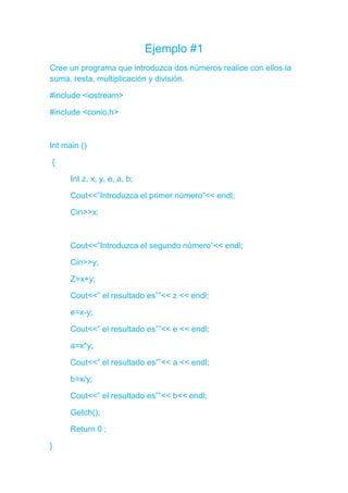 El documento presenta dos ejemplos de código C++ para realizar operaciones matemáticas. El primer ejemplo permite introducir dos números y realiza la suma, resta, multiplicación y división. El segundo ejemplo muestra un menú con opciones para suma y resta, permitiendo seleccionar una opción. Ambos ejemplos utilizan funciones como cout, cin, getch() y return para mostrar mensajes e introducir y procesar datos numéricos.