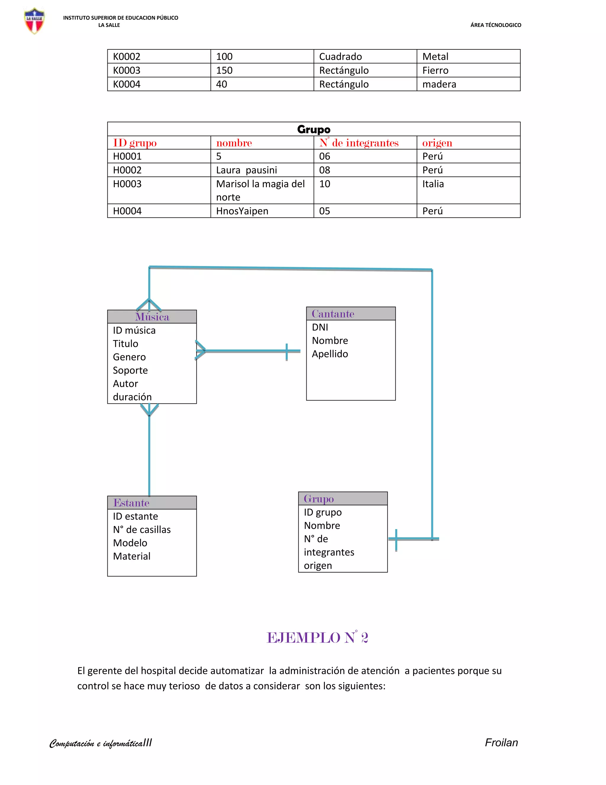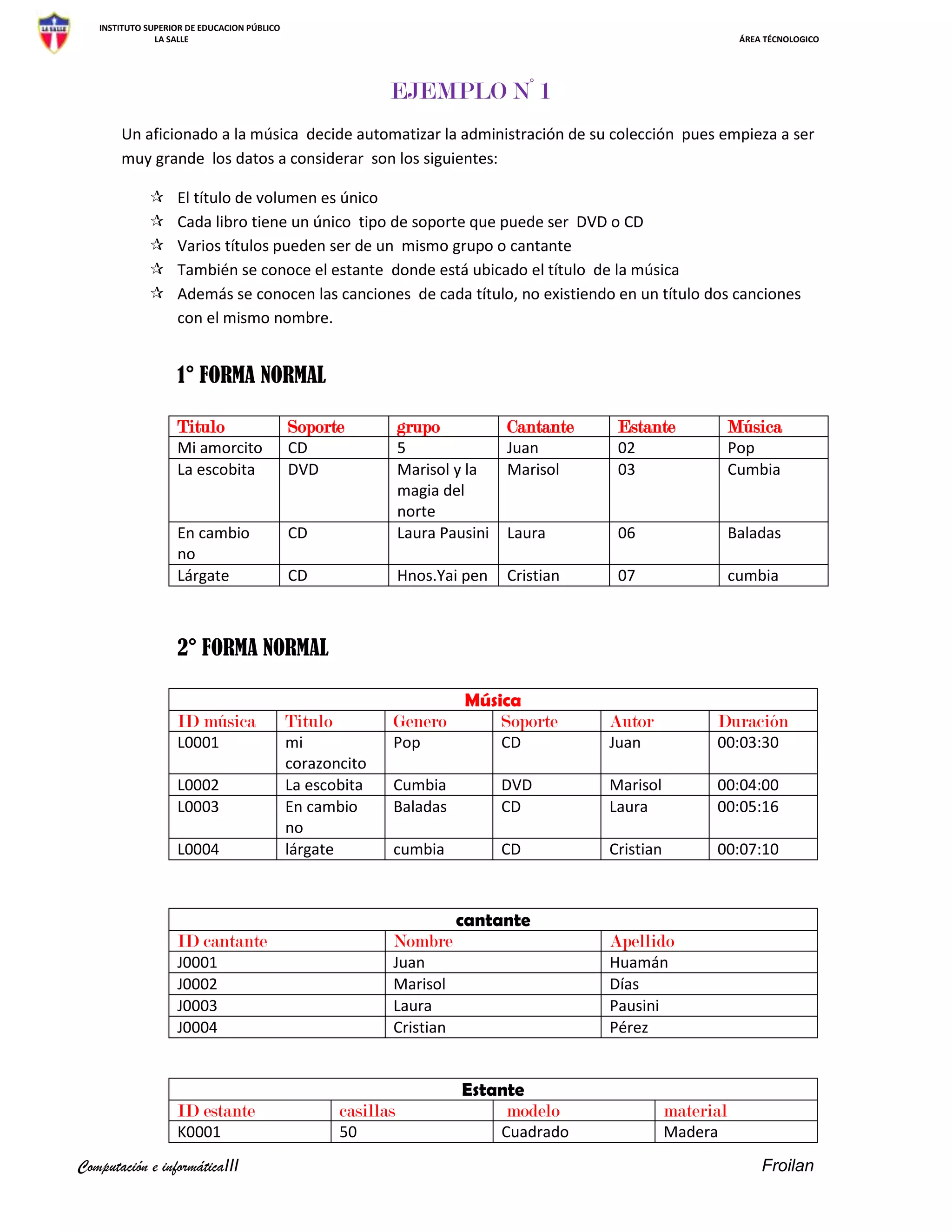 Este documento presenta la automatización de la administración de una colección de música y de la atención a pacientes en un hospital. En ambos casos, se propone dividir la información en dos formas normales para organizar los datos de títulos musicales, artistas, canciones, médicos, pacientes, exámenes y pruebas. Se incluyen detalles como género, soporte, autores, duración, especialidad, hospital, ubicación y resultados.