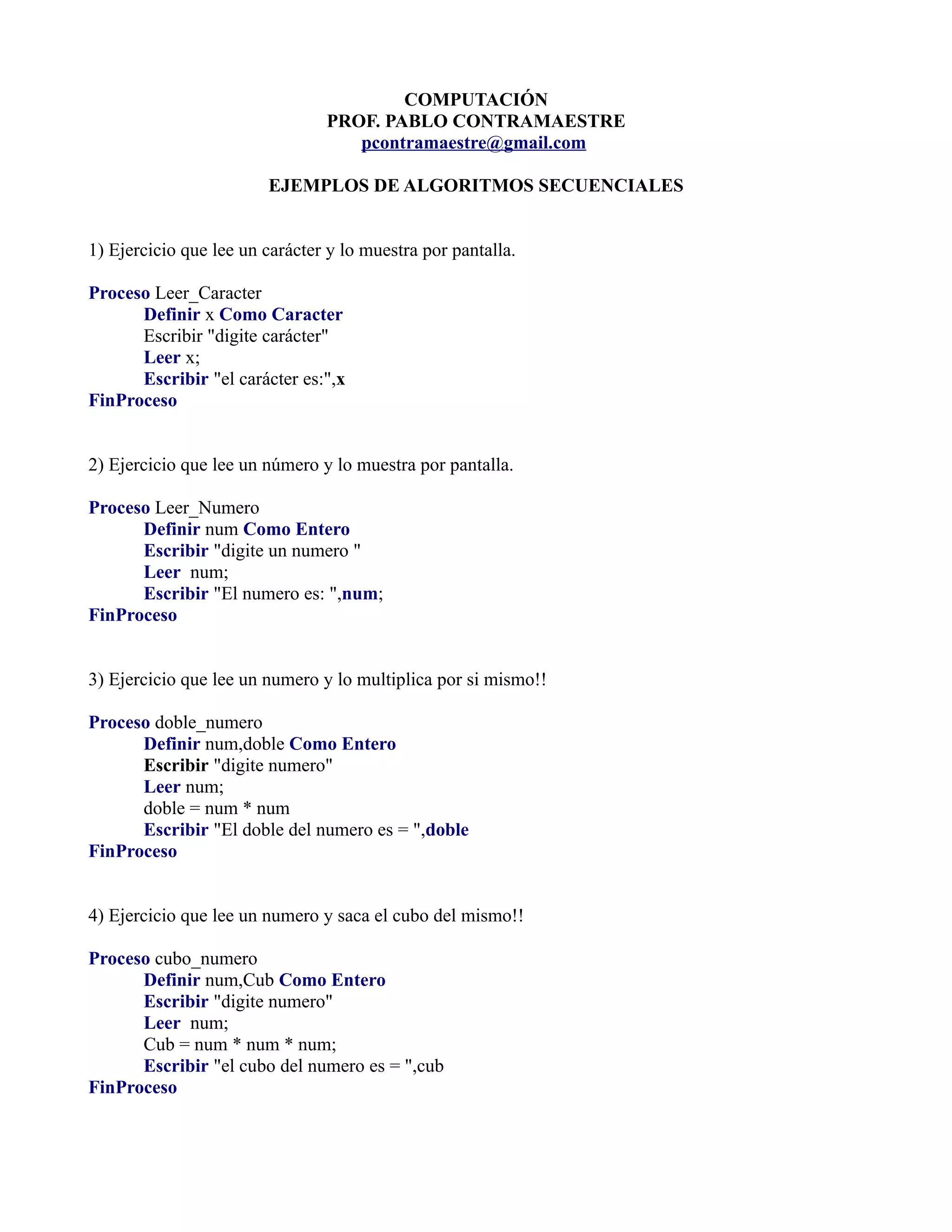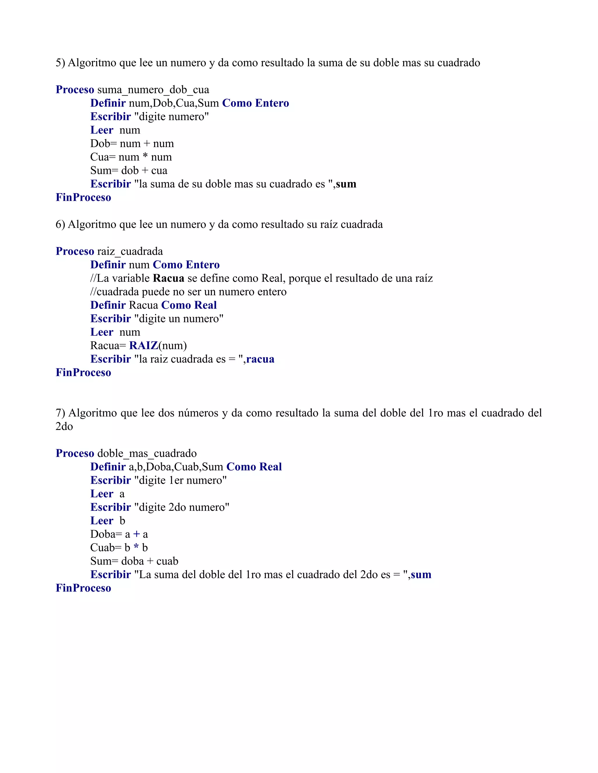 El documento presenta 7 ejemplos de algoritmos secuenciales. Cada algoritmo lee uno o dos números de entrada, realiza una operación matemática (como doblar, elevar al cubo, sacar raíz cuadrada, etc.) y muestra el resultado por pantalla. Los algoritmos ilustran conceptos básicos de programación como definición de variables, entrada y salida de datos, y operaciones aritméticas.