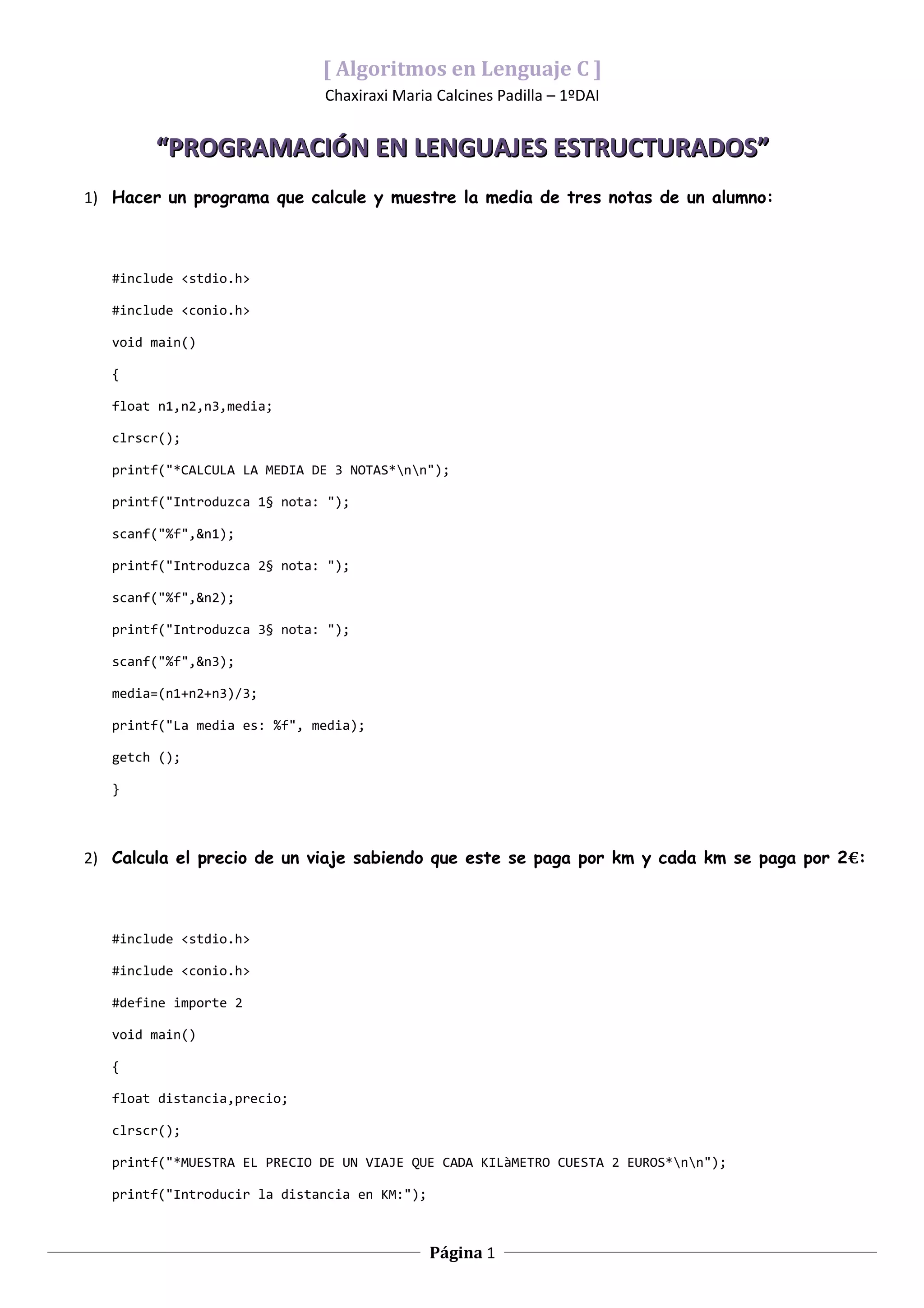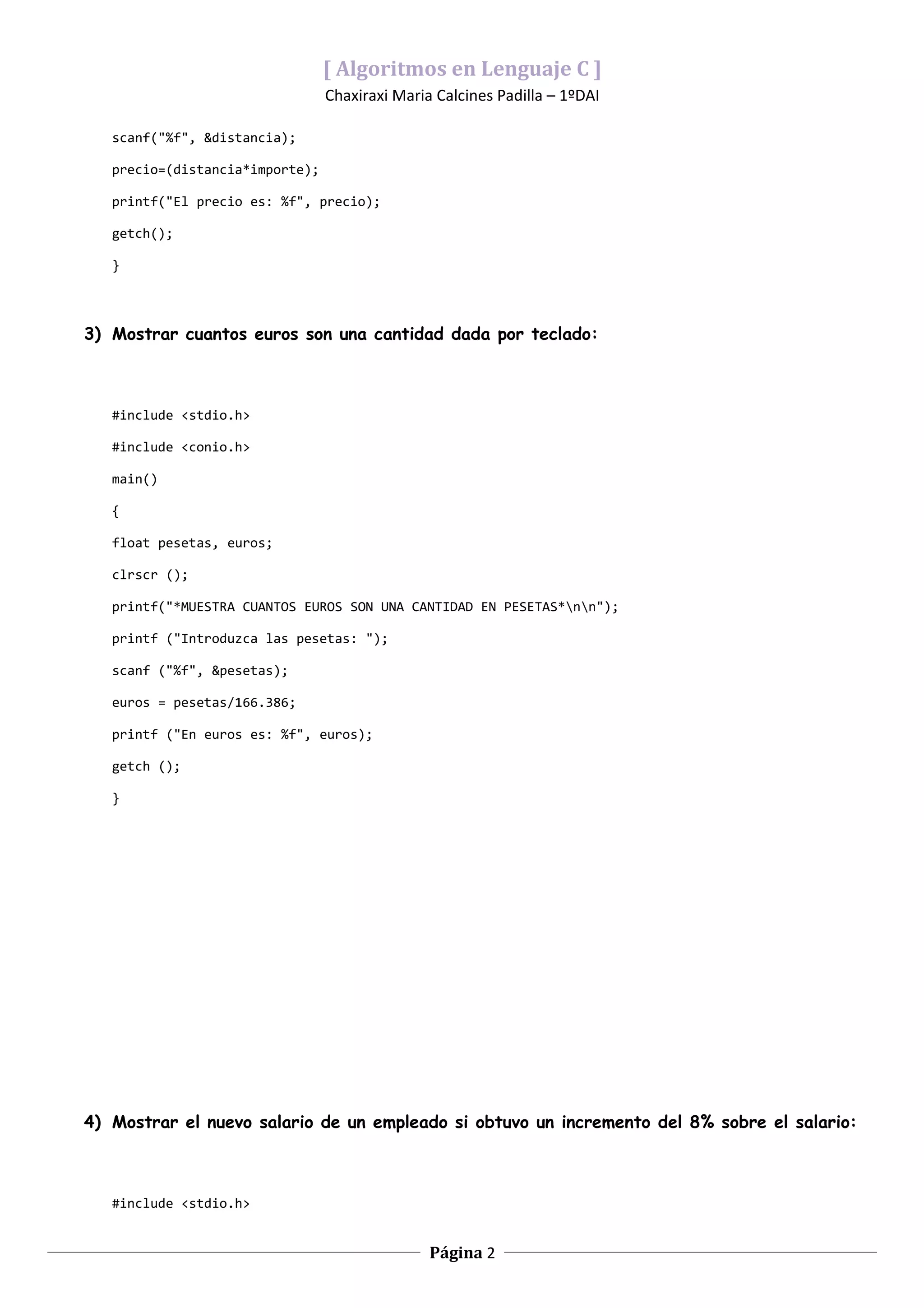 3) El documento provee el código completo en C para cada algoritmo junto con explicaciones breves sobre lo que cada programa calcul