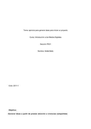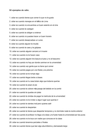 Este documento presenta dos listas de 50 ejemplos cada una sobre situaciones que generan odio y amor respectivamente. La lista de odio incluye ejemplos como comer algo que no te gusta, estar atrapado en el tráfico o reprobar un curso, mientras que la lista de amor incluye estar con la familia, ayudar a otros o lograr tus metas. El objetivo del documento es generar ideas a partir de experiencias compartidas sobre lo que causa diferentes emociones.