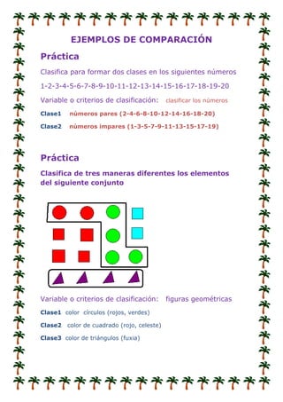 El documento presenta dos ejemplos de clasificación. El primero clasifica números del 1 al 20 en dos clases, números pares e impares. El segundo clasifica figuras geométricas (círculos, cuadrados y triángulos) de tres colores diferentes en tres clases distintas.