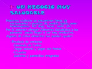 Este documento presenta varias ideas de negocio como un negocio de alimentos saludables, sistemas de reciclaje de agua, pañales para perros y artesanías de hierro. También identifica cuatro factores que pueden generar nuevas necesidades y oportunidades de negocio: un aumento en los ingresos personales, un aumento en el nivel educativo, un aumento en el tiempo libre, y un aumento en la esperanza de vida.