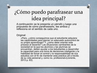 El documento presenta dos ejemplos de cómo parafrasear párrafos manteniendo el sentido original pero usando nuestras propias palabras. En el primer ejemplo, se parafrasea un párrafo sobre la necesidad de que los estudiantes desarrollen la capacidad de autoaprendizaje y toma de decisiones. En el segundo ejemplo, se parafrasea un párrafo sobre un estudio que encontró que los estudiantes de posgrado se vuelven competentes de forma gradual a través de la combinación de práctica y enseñanza disciplinar. El documento con