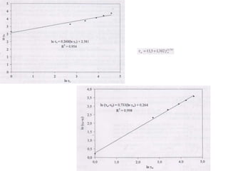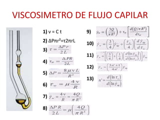 El documento presenta ejemplos de cálculos para determinar la viscosidad de diferentes líquidos usando diferentes tipos de reómetros, incluyendo un viscosímetro de flujo capilar, un viscosímetro de caída de bola y un viscosímetro de cono y placa. Se proporcionan datos como la densidad, el tiempo de caída y la temperatura, y se describen los pasos para calcular la viscosidad y la energía de activación usando la ecuación de Arrhenius.