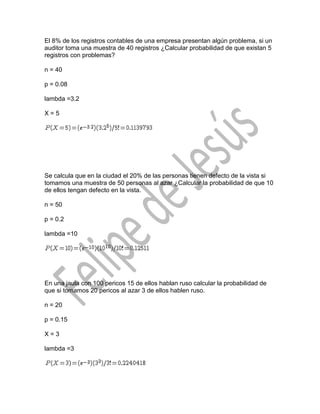 El documento presenta 5 ejemplos de cómo calcular la probabilidad de eventos usando la distribución de Poisson. En cada ejemplo se da el número de muestras (n), la probabilidad de éxito (p), y se pide calcular la probabilidad (X) de que ocurran cierto número de éxitos.