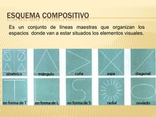 El documento describe diferentes esquemas composicionales que organizan los elementos visuales en una obra, incluyendo esquemas simétricos axiales y radiales, en triángulo, aspa, diagonal, forma de T, L, óvalo, cuña y zig-zag. Proporciona ejemplos de obras que utilizan esquemas en triángulo, forma de T y L.