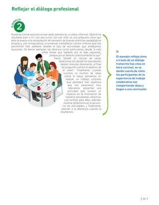 El documento describe tres ejemplos de experiencias de trabajo entre profesionales. Los ejemplos ilustran tanto los desafíos como los logros que pueden surgir a través del diálogo y la colaboración. El primer ejemplo muestra cómo a través de un diálogo se identificaron diferencias en las expectativas sobre los estudiantes. El segundo ejemplo describe cómo a través del intercambio de ideas se llegó a una conclusión. Y el tercer ejemplo narra el proceso de diálogo que llevó a la implementación de una propuesta educativa.