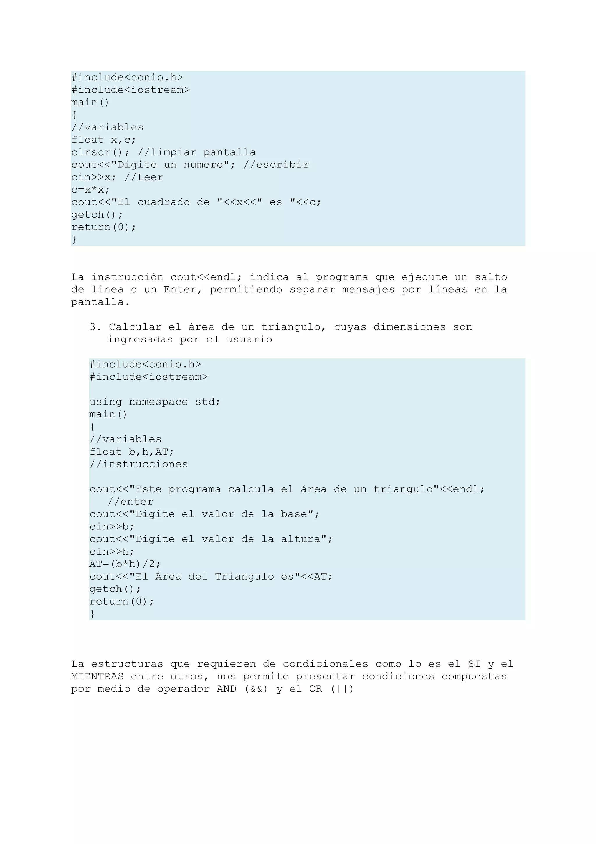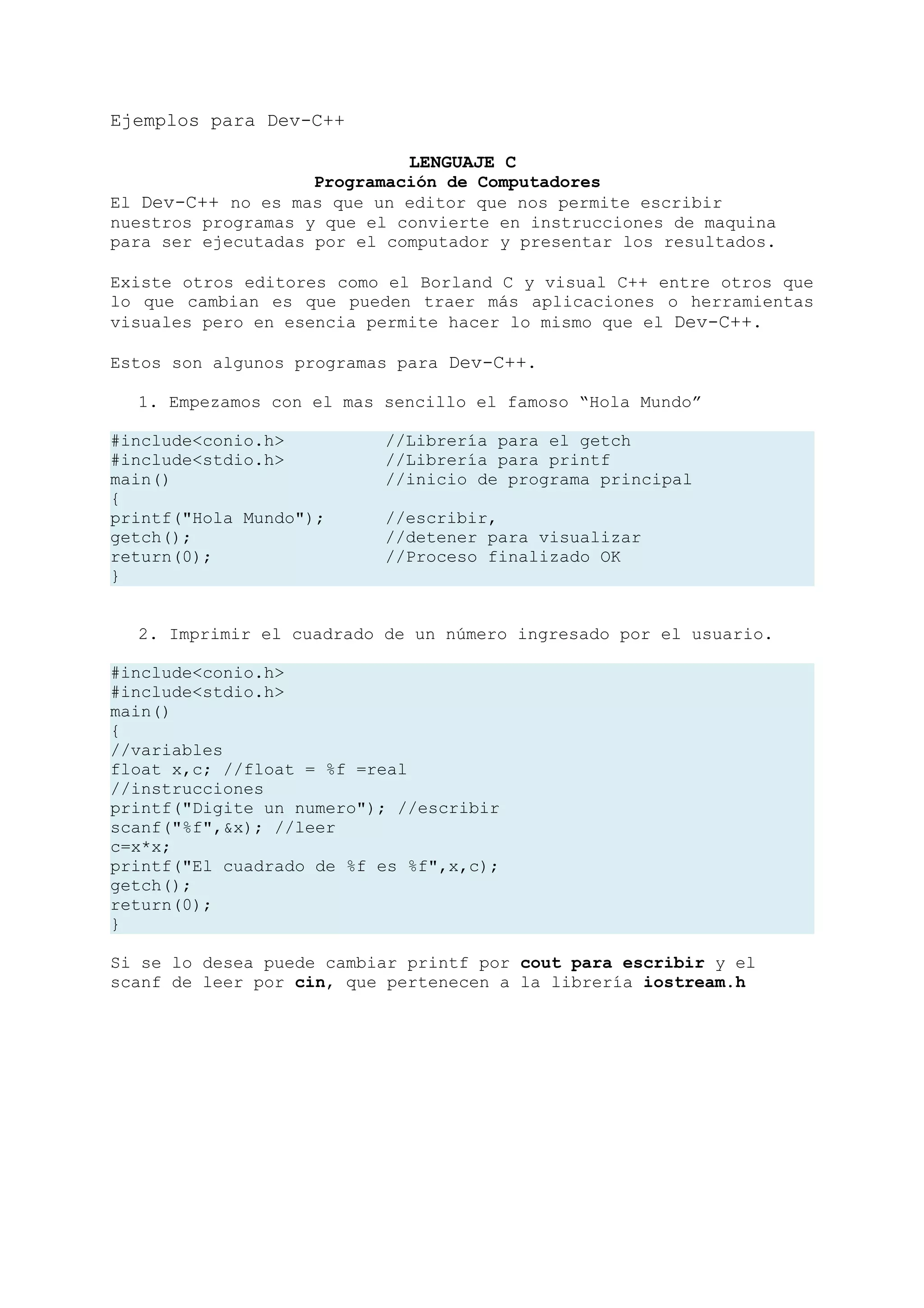 Este documento presenta 7 ejemplos de programas en C++ usando el editor Dev-C++. Los ejemplos incluyen imprimir "Hola Mundo", calcular el cuadrado de un número, calcular el área de un triángulo, determinar el mayor de 3 números, imprimir los divisores de un número, calcular el mayor de un conjunto de números reales, e imprimir el factorial de un número. El documento también incluye un taller con 12 ejercicios adicionales.