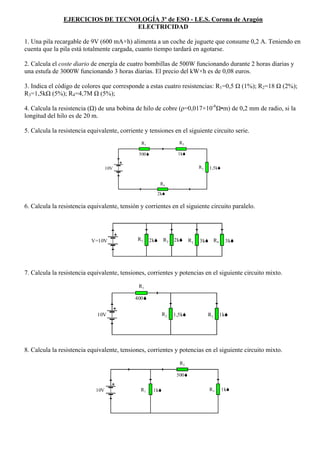 Este documento presenta 12 ejercicios de electricidad sobre temas como cálculos de tiempo de descarga de una pila, costo energético de bombillas y estufas, códigos de colores de resistencias, cálculo de resistencias en bobinas y circuitos, y cálculos de corriente, tensión y potencia en circuitos en serie, paralelo y mixtos. Los ejercicios abarcan conceptos básicos de electricidad aplicados a diferentes configuraciones de circuitos.