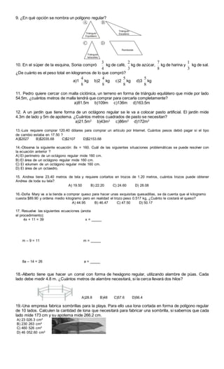 1. El documento presenta 30 preguntas de matemáticas sobre fracciones, conversiones, ecuaciones, áreas y perímetros para una actividad de regularización. Incluye instrucciones para resolver los problemas y anotar las respuestas.