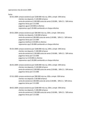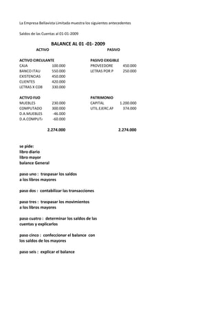 El documento presenta los saldos iniciales de las cuentas de la empresa Bellavista Limitada al 1 de enero de 2009. Luego detalla las transacciones realizadas por la empresa durante el mes de enero de 2009, incluyendo compras, ventas, pagos y cobros. Finalmente, muestra los saldos finales de las cuentas al 8 de enero de 2009 y los estados financieros resultantes, incluyendo el balance general y el estado de resultados.