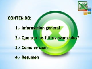 Los filtros avanzados en Excel permiten realizar búsquedas más complejas que los filtros normales mediante la introducción de criterios de filtrado en una zona separada de la tabla. Para aplicar un filtro avanzado, se selecciona la tabla, se introducen los criterios de filtrado en otra área, y luego se selecciona la opción "Filtro avanzado" para mostrar sólo las filas que cumplen esos criterios. Esto permite crear filtros personalizados sin límites de lista desplegable.