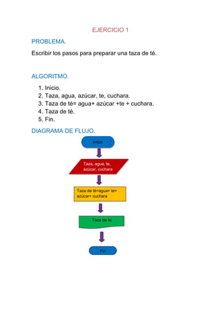 El documento contiene 20 ejercicios que presentan problemas y sus respectivos algoritmos y diagramas de flujo para resolverlos. Los ejercicios cubren temas como preparar comidas, realizar cálculos matemáticos, ordenar datos y determinar el mayor o menor valor de una serie de números.