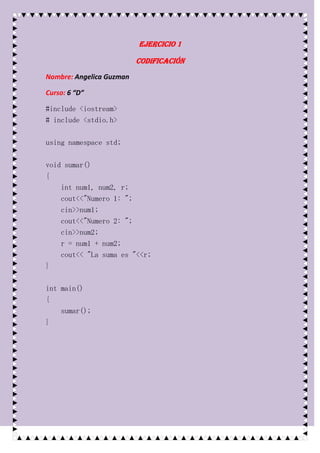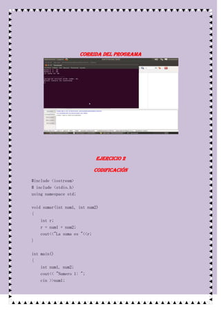 El documento presenta 5 ejercicios de codificación en C++ para sumar dos números. Cada ejercicio implementa la función sumar() de diferentes formas, recibiendo los números como parámetros o pidiéndolos por entrada, devolviendo el resultado o imprimiéndolo. El objetivo es practicar diferentes formas de definir y llamar a funciones en C++.