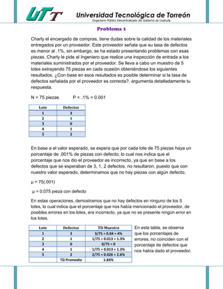 Este documento presenta los resultados de dos ejercicios de probabilidad realizados por un ingeniero para evaluar la calidad de los materiales suministrados por un proveedor. En el primer ejercicio, el ingeniero inspeccionó 5 lotes de 75 piezas cada uno y encontró más defectos de los reportados por el proveedor, lo que indica que la tasa de defectos dada por el proveedor era incorrecta. En el segundo ejercicio, el ingeniero elaboró diagramas para identificar problemas de calidad y tomó acciones correctivas, luego inspeccionó 6 lotes de 1000
