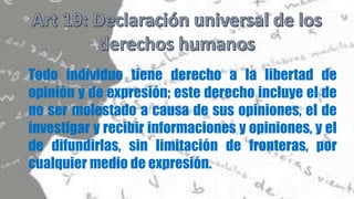 Todo individuo tiene derecho a la libertad de opinión y expresión, incluyendo no ser molestado por sus opiniones, investigar e recibir información sin limitaciones de fronteras a través de cualquier medio de expresión.