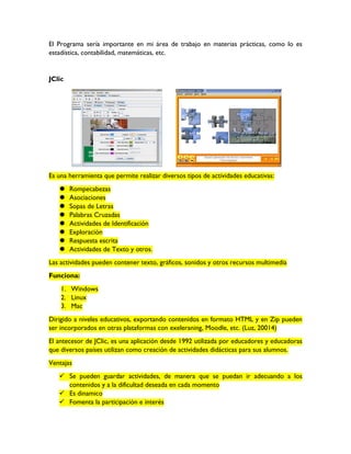 El documento describe diferentes herramientas educativas como Hot Potatoes, JClic, Squeak, Descartes y MALTED. Cada una permite crear actividades interactivas con diferentes recursos multimedia para ser utilizadas en el aula. Algunas ventajas mencionadas son que fomentan la participación de los estudiantes, permiten exportar contenidos a otros formatos y plataformas, y son multiplataforma.